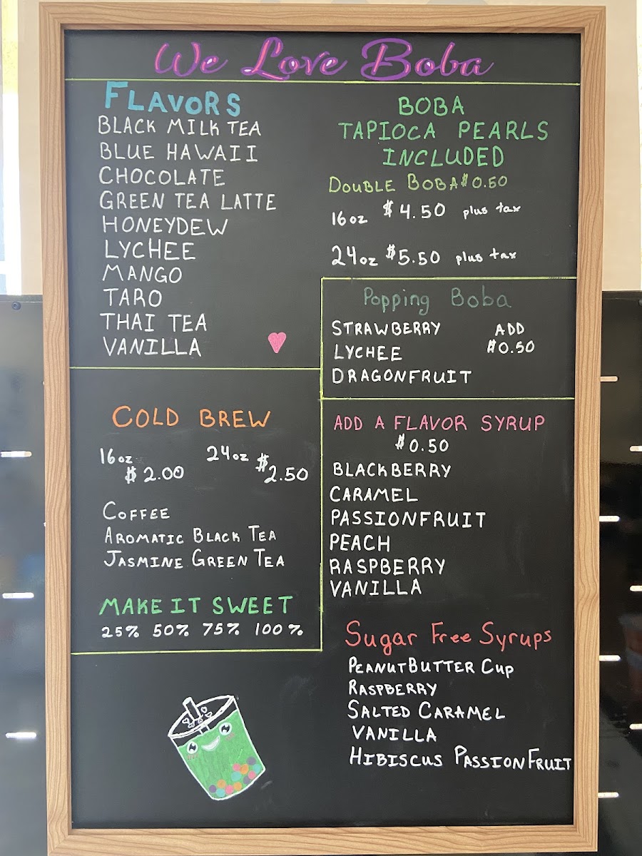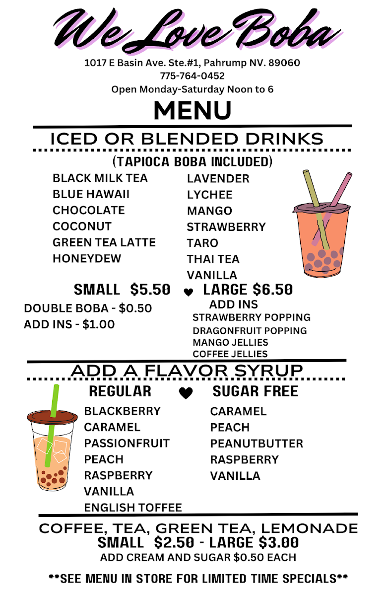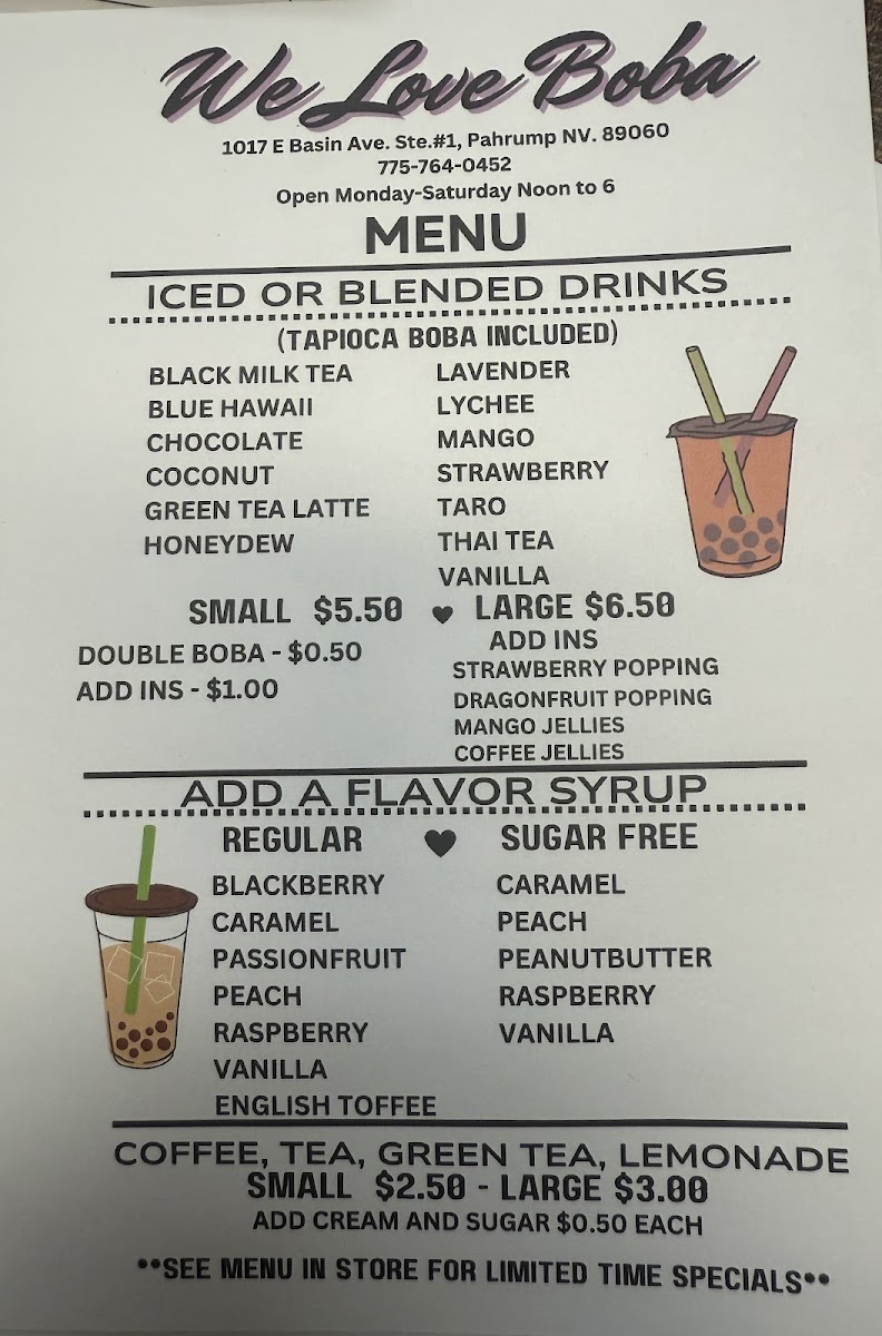 The We Love Boba Menu at 1017 E Basin Ave in Pahrump, NV, is a delightful experience for anyone who enjoys the refreshing and customizable world of bubble tea. The menu features a variety of flavors and drinks that cater to all kinds of tastes, whether you're looking for something sweet, creamy, or a bit more refreshing. For fans of traditional milk tea, the Black Milk Tea is a staple, offering a rich, creamy base with that unmistakable tea flavor. If you're in the mood for something a little more exotic, the Blue Hawaii flavor provides a tropical twist, blending fruity notes that are both refreshing and delicious. For chocolate lovers, the Chocolate Green Tea Latte is an intriguing combination that balances the richness of chocolate with the earthy undertones of green tea.
